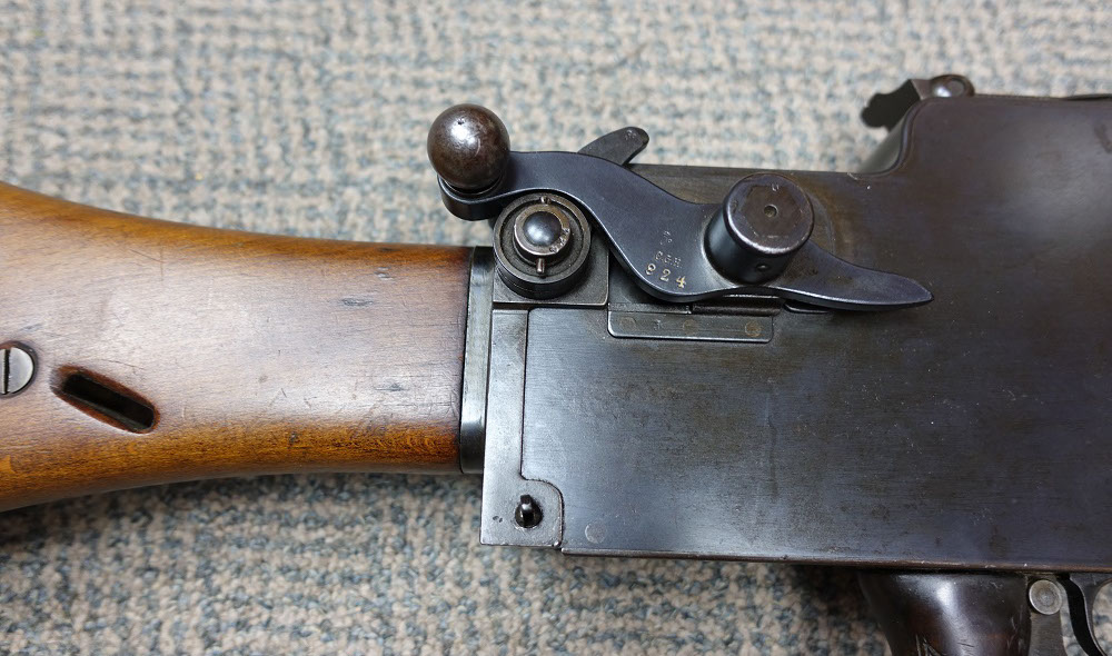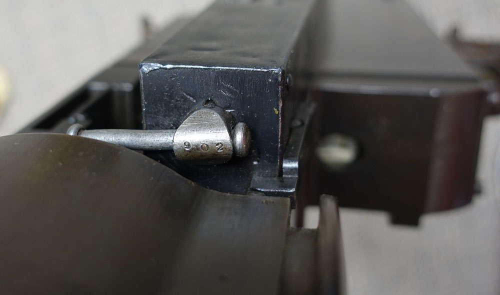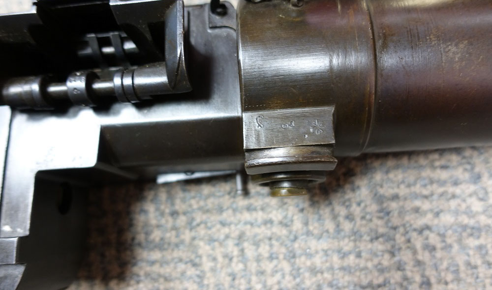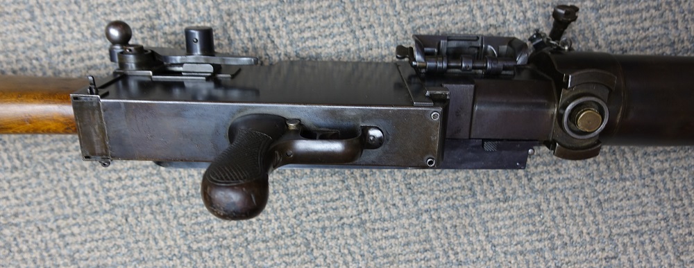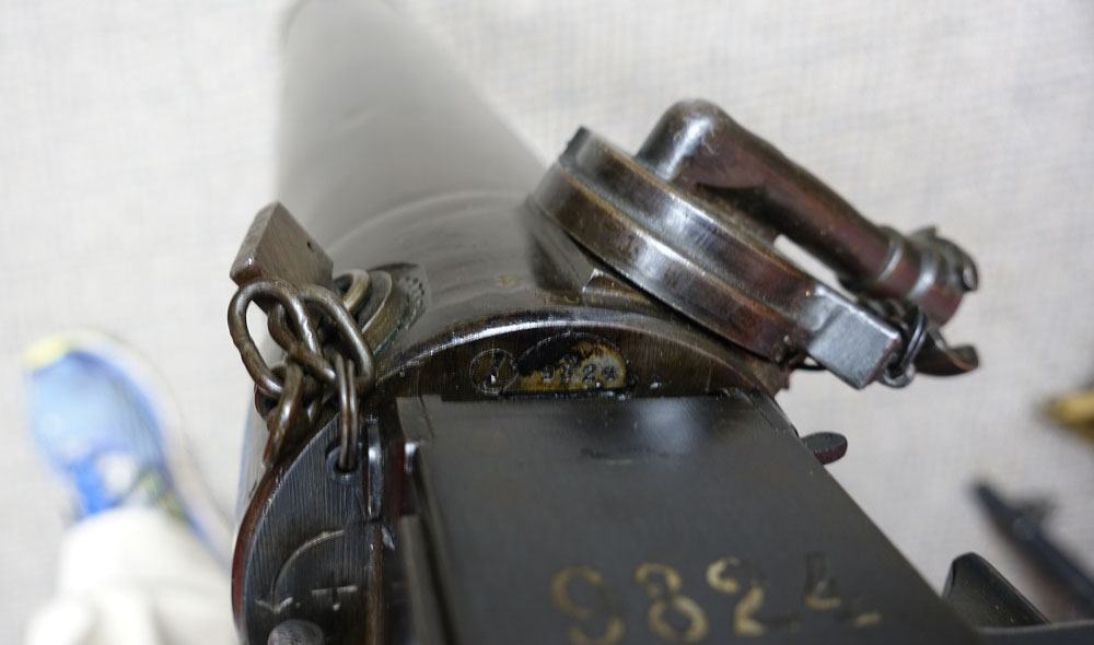 This 08/15 Maxim was the “portable” machine gun used by the Germans in WWI, along with the heavy 08 Maxim. Both guns functioned the same and used the same barrels, the same locks, the same belts and 8mm Mauser ammunition. Yet this machine gun could be carried and operated by a single soldier. Because of its portability, it proved a lethal enemy for US soldiers, so each captured Maxim quickly became a cherished war relic. This Maxim was registered in the 1968 Amnesty as serial number 9824-5020, using the 9824 serial number on the receiver and the 5020 serial number on the lock. See photos below. As the photos show, it is in very good condition with much of its original bluing. It fired flawlessly, using an original 250 rd Swiss Maxim steel belt, which will be included. Swiss Maxim belts are very easy to load by hand, unlike the German Maxim cloth belts. A video is available of this gun shooting, just email sales@fullautoclassics.com for it. It fires 8mm Mauser ammunition, the same cartridge used in the German 98 Mauser bolt-action rifle issued to most of that nation’s soldiers in WWI and WWII. This ammunition is easy to acquire and easy to reload if you choose to do so. The history and operational instructions of these Maxim water-cooled machine guns are well presented in Dolf Goldsmith’s book: The Devil’s Paintbrush. A copy is included, as is a Russian 1910 Maxim Gunner’s Kit, which has several useful tools and a spare Maxim mainspring for the lock. $12,500. Visa/MC acceptable. Class 3 dealer since 1978. Trades considered, even non-functioning or DEWAT machine guns.